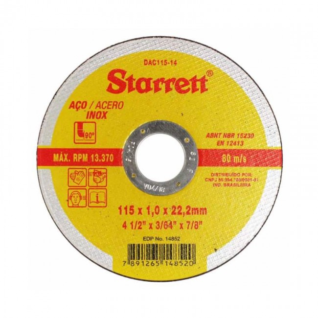 Disco de corte inox 4.1/2” x 1,0mm Starrett é fabricado de acordo com a norma EM 12413 e NBR 15230. É ideal para corte de materiais em aço carbono e aço inox, como tubos, chapas, perfil, e outros materiais ferrosos. É um produto altamente utilizado em serralherias, na construção civil, caldeiraria, oficinas e outros.